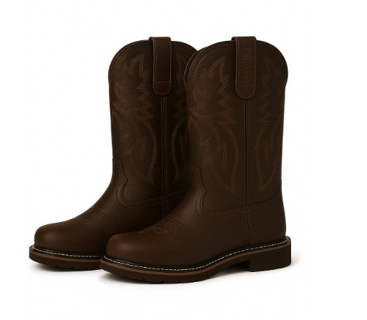 Style: Pull-on cowboy or work boot with a broad square toe.